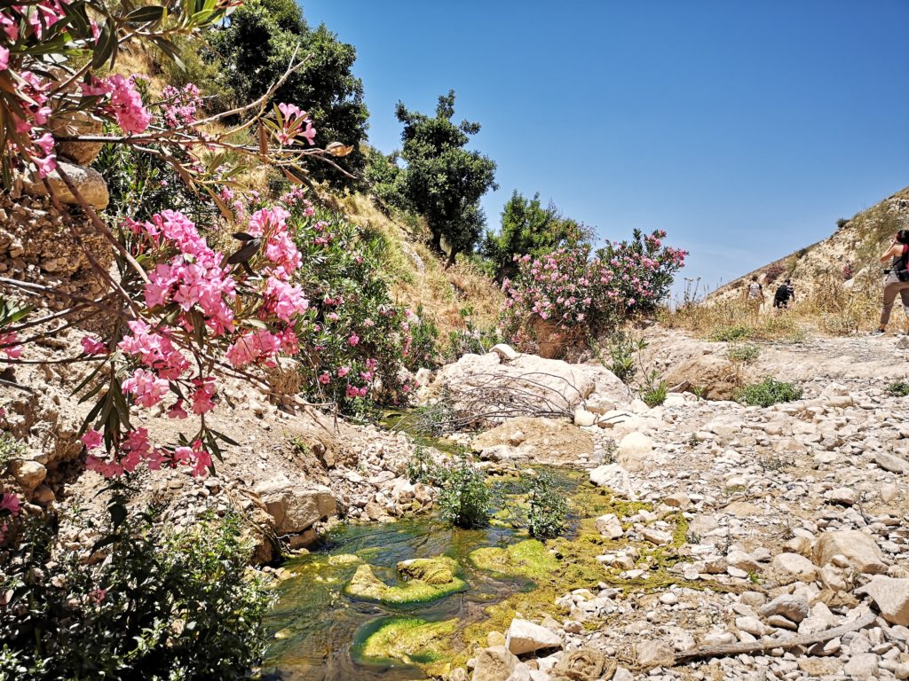 Samochód zostawiliśmy na parkingu Visitors Centre, wsiedliśmy na pakę pickupa dyrektora i ruszyliśmy w drogę. Szlak zaczynał się w pobliżu Princess Basma Center w Al- Mansoura i prowadził niemal cały czas piękną doliną. Po drodze można było podziwiać lokalną roślinność – m.in. drzewa karob, sosny alepskie, dęby, drzewa pistacjowe i kilka gatunków kwiatów. Nasz przewodnik, chociaż nie był zbyt rozmowny (pewnie dlatego, że w zasadzie nie był przewodnikiem, a botanikiem), pochwalił się, że sam opisał kilkadziesiąt gatunków roślin znajdujących się w rezerwacie.
